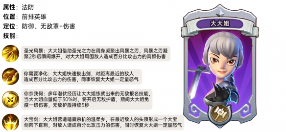 你奈我何:多年潜伏经历让大大姐练就出来的无敌报名技能,当大大姐血量低于30%时,将开启无敌护盾,期间大大姐免疫一切伤害,无敌护盾持续5秒;