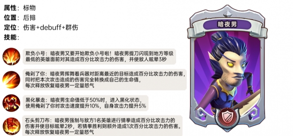 暗夜男生命值低于50%时,进入黑化状态,使用俺剁了你时攻击速度提升10%,自身攻击力提升5%