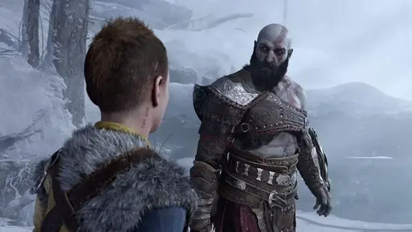 游戏开始后,画面来到米德加尔特的一个洞穴中,奎托斯坐在火堆旁帮儿子削箭,阿特柔斯扛着一只鹿从风雪中出现。