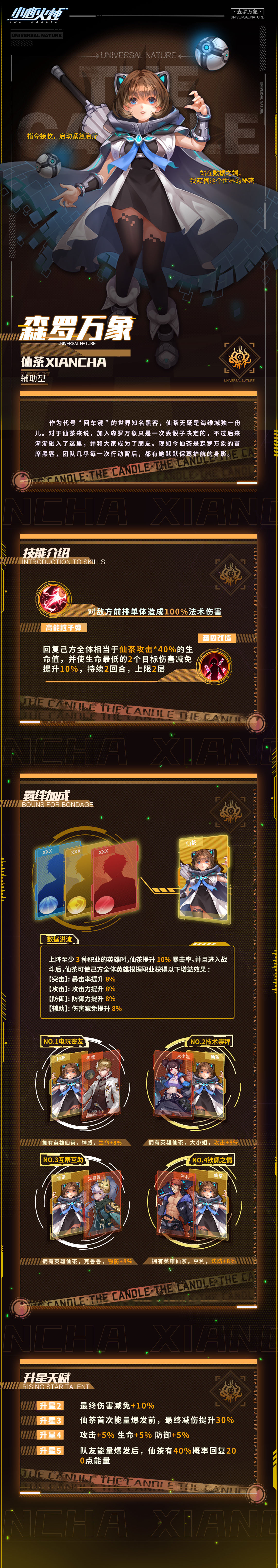 1、仙茶是一名辅助型英雄,拥有较强的治疗回能增益