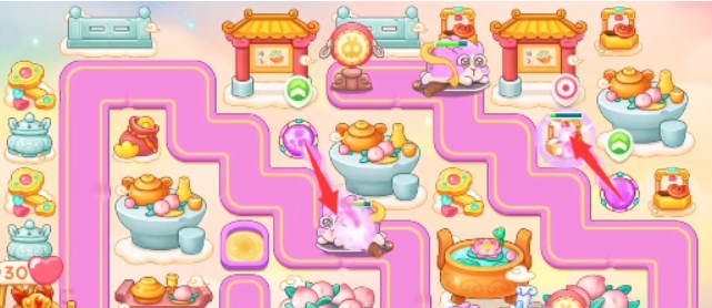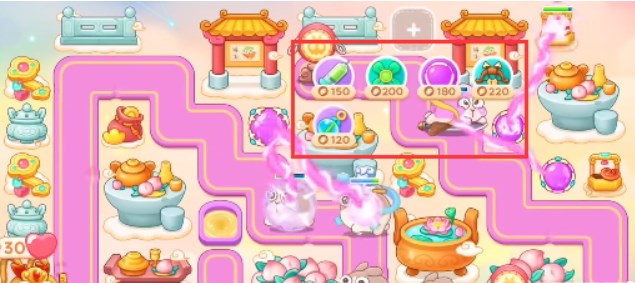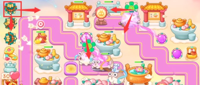 3、上方放置风扇,左上角放置多重箭,将这两个炮塔附近的道具打开,风扇附近继续放风扇,多重箭附近放多重箭。
