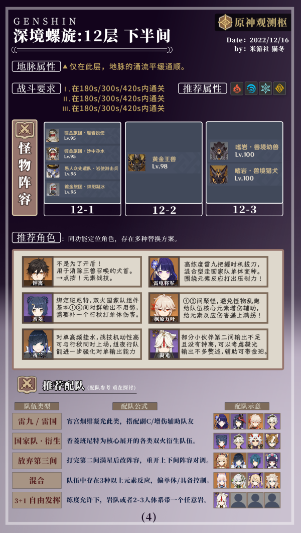其实像这几个BOSS,在历代版本的深境螺旋中已经挑战过数次了,基本都是灌输出,关键是要记得如何去应对它们的特殊机制与如何将它们打进虚弱机制。
