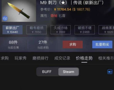 即花大约17元钱在游戏的箱子里去抽取饰品,(目前普通箱子的售价在5元左右,再加上钥匙的成本,所以开箱的固定成本大概在17元左右)。而抽到的饰品少到好几百,多到几十万,直接出售即可套现。类似的饰品在不同时期不同背景下价格也不尽相同,比如某些饰品在著名赛事中有明星使用过,因为有明星效应的加持,这件饰品比同类型产品的价格至少高出好几倍。比如这把匕首,除去1%的手续费,玩家可以赚到至少一万元。