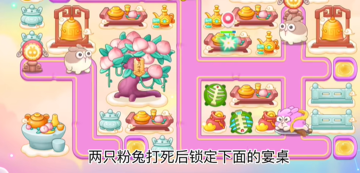 1、建立两个鱼骨,一个打上面桌子,一个打怪物,刚开始的时候会有两只滑板兔,注意锁定,注定完,利用间隙两个鱼骨一起打旁边桌子。