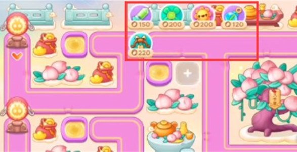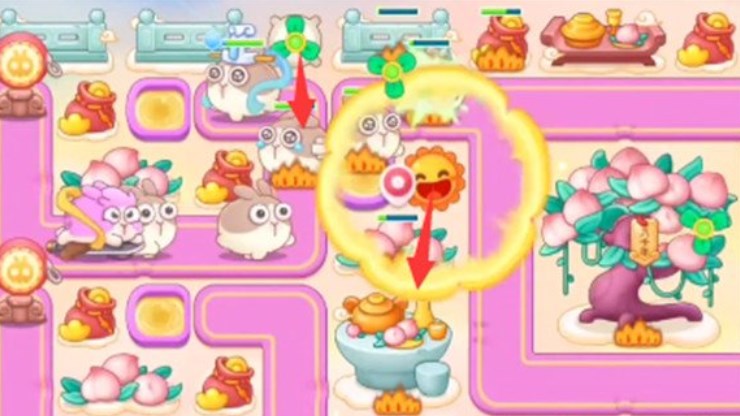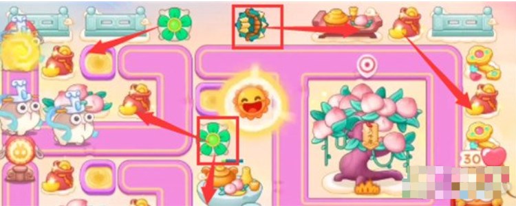 2.然后去清理左边的一个大型道具,打到之后,我们造上一个弓箭,这里可以先锁定上方的钱袋,等待着右边的滑板兔全部死掉,然后再锁定桃树。