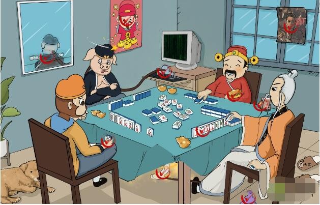 2、八戒后面有镜子偷看,墙上有财神,悟空手里在变牌