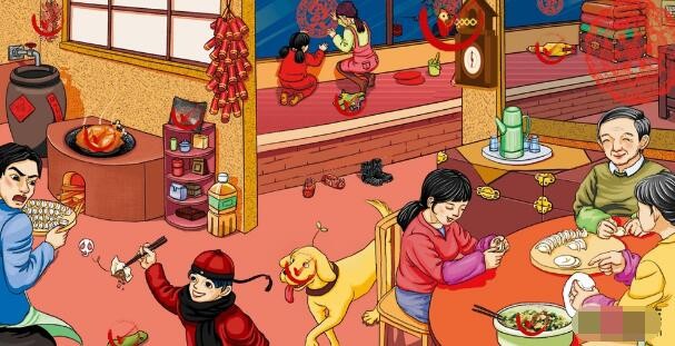 2、左下角有一只田鸡,旁边的狗是斗鸡眼,右边的饺子馅是韭菜鸡蛋