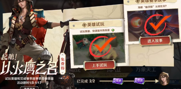2、我们需要完成两个活动,就能获得对应的5折卡了。(英雄试玩、英雄赛季故事)