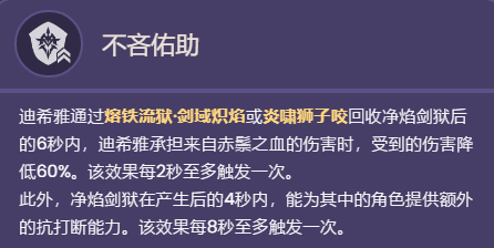 迪希雅通过熔铁流狱剑域炽焰或炎啸狮子咬回收净焰剑狱后的6秒内,迪希雅承担来自赤鬃之血的伤害时,受到的伤害降低60%。该效果每2秒至多触发一次。