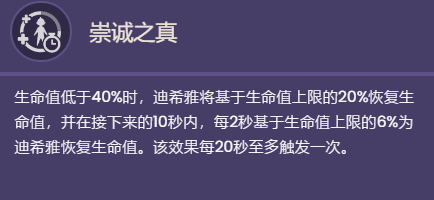 生命值低于40%时,迪希雅将基于生命值上限的20%恢复生命值,并在接下来的10秒内,每2秒基于生命值上限的6%为迪希雅恢复生命值。该效果每20秒至多触发一次。