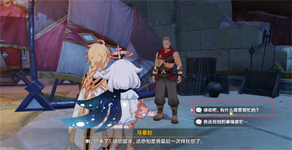 1:首先我们前往千壑沙地神像下方的位置接取任务,然后把游戏的时间往后调整一天,找到下面的马赛拉接取任务;