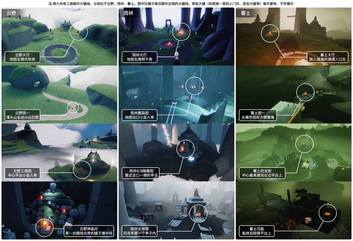 今日大蜡烛位于云野、雨林、暮土,小伙伴们可以参考下图进行寻找: