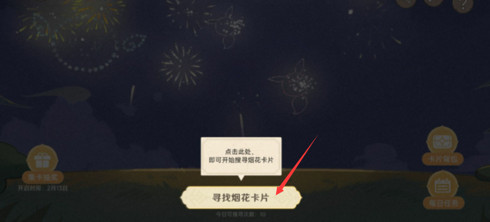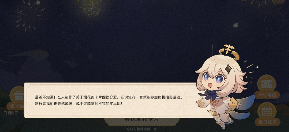活动介绍:可以在活动中通过收集和交换烟花卡片,拥有一定种类的烟花卡片后,解锁抽奖功能。参与抽奖,赢取实物或游戏内奖励。