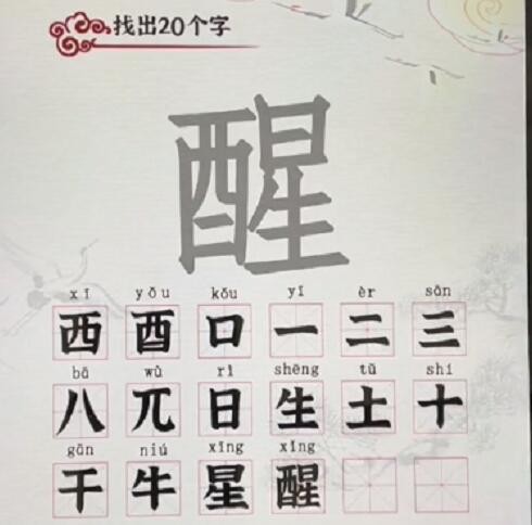 1、醒找出20个字答案:西、酉、口、一、二、三、八、兀、日、生、土、十、干、牛、星、醒、四、土、圼、早。