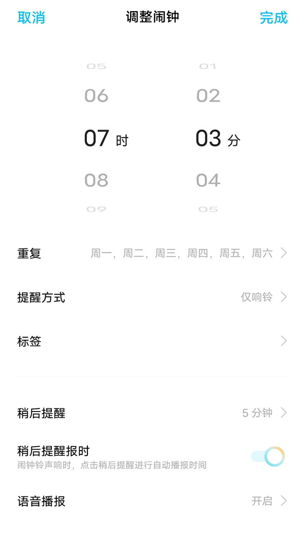 2、设置闹钟时间、提醒方式、间隔时间等后保存即可。