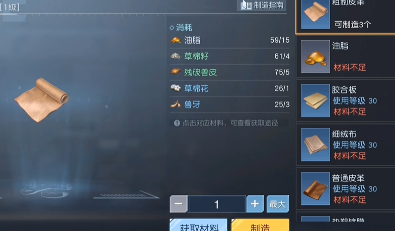 6、自行制造,点击武器制作或者防具制作,但升级材料是需要采集原始材料或购买,再进行制造,升级庄园的材料基本上都能够在这里找到。