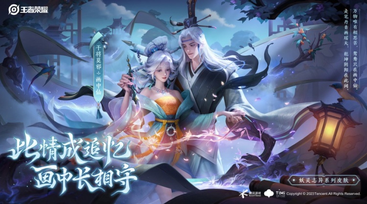 “万物唯有相思苦,鸳鸯只在画中仙!”以传统民间志异传说为灵感,将干将莫邪设计为一对跨越生死分离,最终以画为媒、双宿双飞的画仙。局内回城、待机、行走动作展现出二人恩爱相处的点滴,传颂真挚感人的夫妻情谊;特效设计对水墨国画中写意的山、水、鱼、鸟元素进行了奇幻浪漫的演绎,丰富了技能轨迹、受击反馈、控制消散等视效。