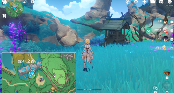 1、我们来到蛇神之首这里,可以看到一个神龛,与旁边的鹫津对话,之后参拜三下神龛,第二天再来参拜;