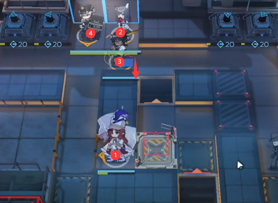 然后如图所示位置部署泥岩吃无人机伤害,再撤退先锋,如图所示在右侧部署闪灵(向下),艾雅法拉(向下),煌(向左),随后挂机即可。