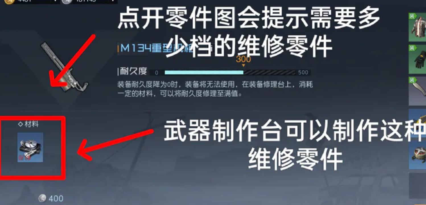 找到维修台查看自己需要什么零件维修(点击材料下面的零件进行查看)。
