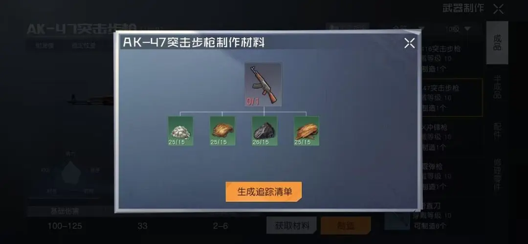 之后使用【装备制造台】点击【武器制作】在右侧列表的武器图标中点击【AK47】,查看是否已集齐当前所需材料,点击【制作】等待倒计时完成后,就可以在【背包】中看到崭新出厂的AK47了。