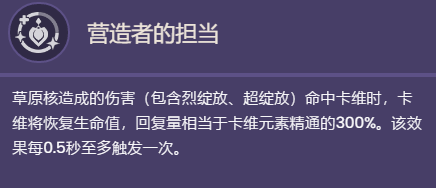 草原核造成的伤害(包含烈绽放、超绽放)命中卡维时,卡维将恢复生命值,回复量相当于卡维元素精通的300%。该效果每0.5秒至多触发一次。