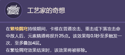 在繁绘隅穹持续期间,卡维在普通攻击、重击或下落攻击命中敌人后,元素精通将提升25点。该效果每0.1秒至多触发一次,至多叠加4层。