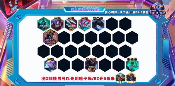 没D到铁男就原阵容补轮子妈或EZ开3未来。后排未来格让卡牌吃,前排未来格让慎吃。