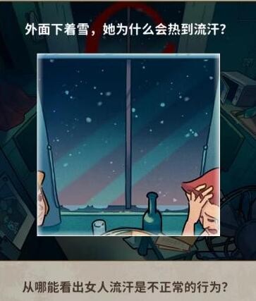 3、从哪能看出女人流汗是不正常的行为?——点击窗帘中间的绳结,可以看到外面在下雪,点击窗户
