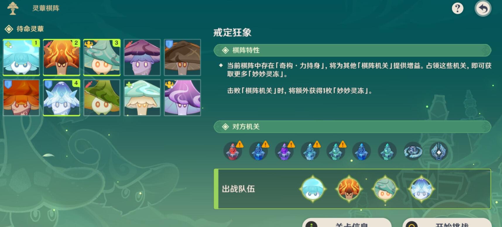 它为其他「棋阵机关」提供增益,强化它们的战斗能力。「小小灵覃」停留在这种机关上方时会使机关失效,并获得更多「妙妙灵冻」。