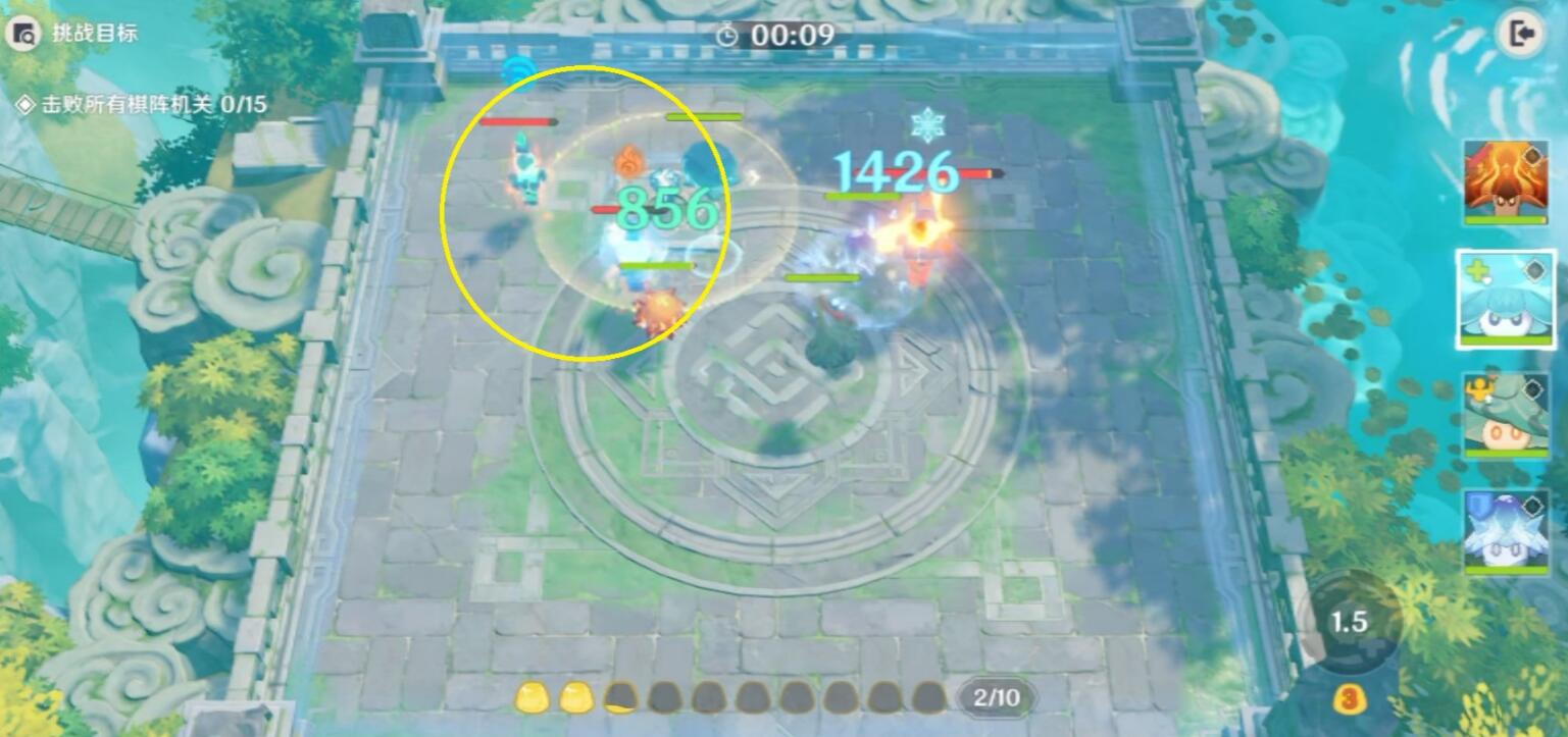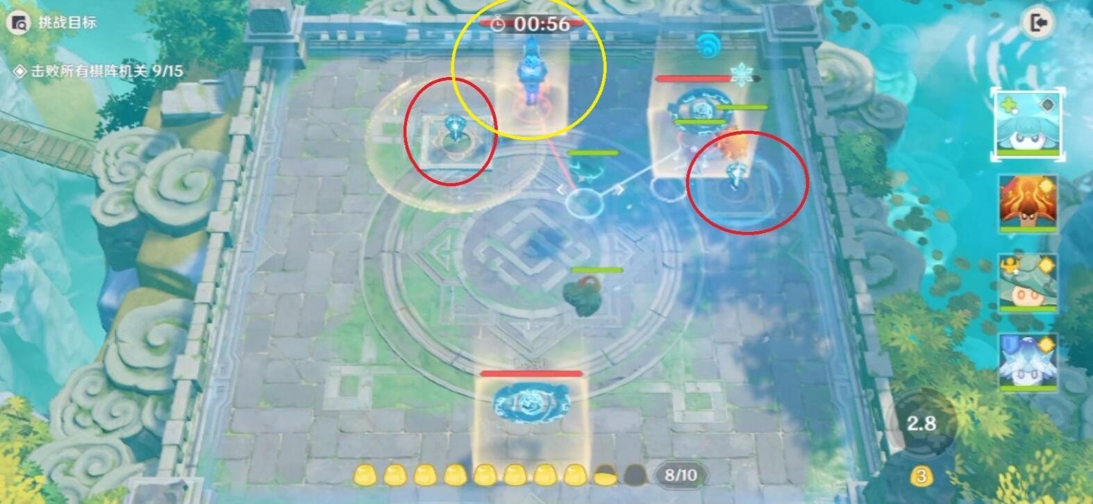 先占领图中【奇构力持身】,然后先消灭上方2个机关,优先攻击水机关(不要让它上盾,如果上盾后,利用风冰破盾)