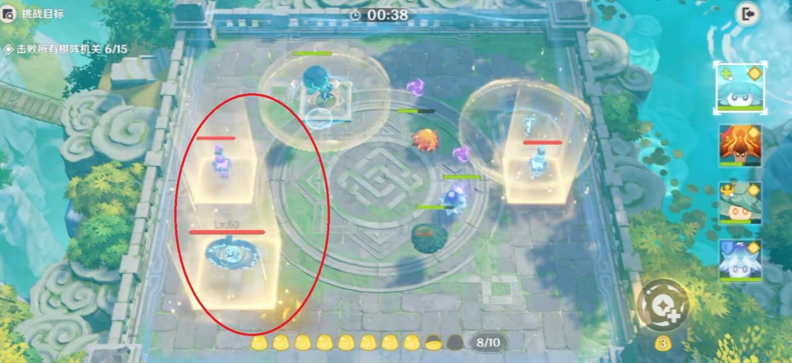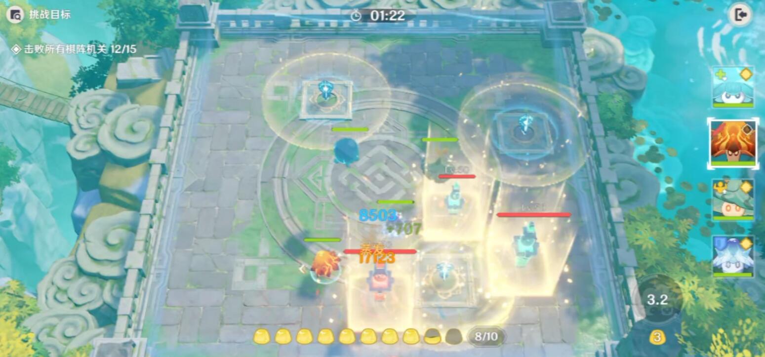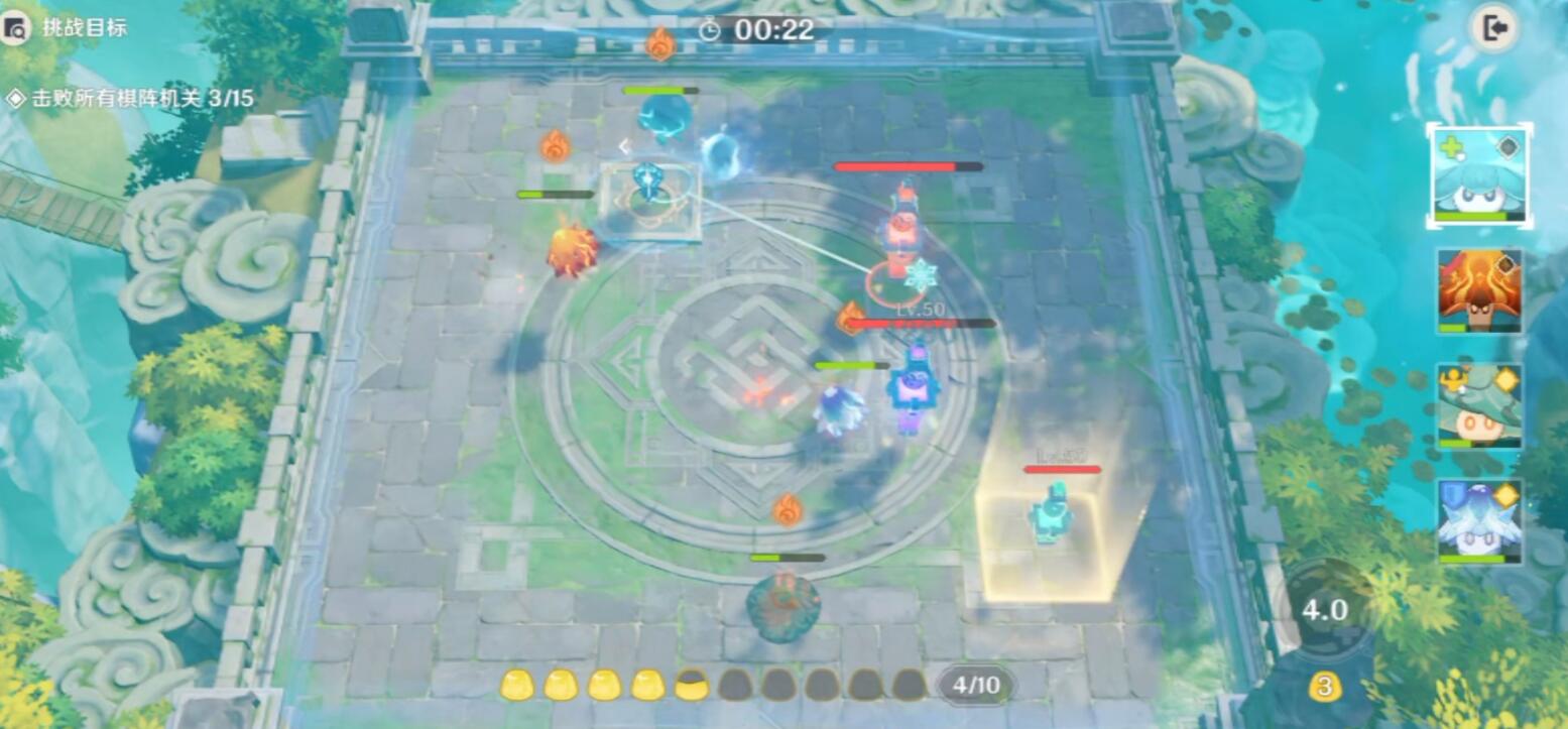 消灭冰机关后又会出现一个机关,这时我们需要利用冰火风的范围伤害将三个机关一举摧毁。