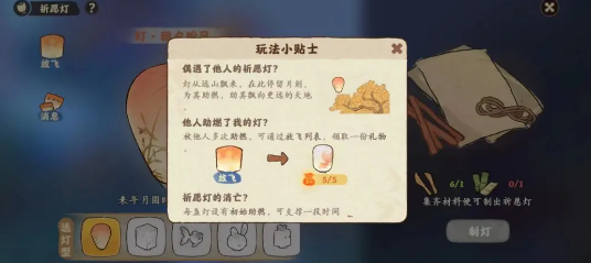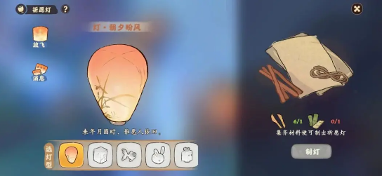 1、祈愿灯需要在16级解锁,是在游戏时间入夜后才可以进入游戏,通过消耗一定的材料制作灯面,许下自己的愿望之后就可以放飞;