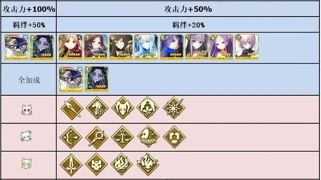 本次活动的从者加成基本上都是kong加成,本次活动新增的两位从者是三种全加成,其他根据职阶分成不同加成,在剧情登场的几位从者有额外的攻击威力和羁绊加成。