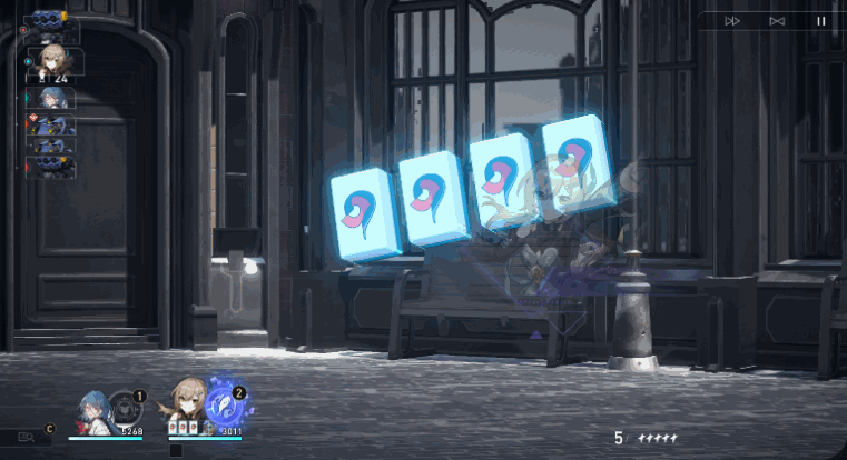 我方目标行动开始前,青雀会随机抽取1张可能是【万字】、【文钱】、【索子】的琼玉牌,最多持有4张。青雀回合开始时,若持有的琼玉牌数为4且花色相同,青雀消耗所有琼玉牌进入【暗杠】,自身攻击力提高36%/36%/29%/43%/46%/50%/54%,并强化普攻。【暗杠】会在施放强化普攻后结束。