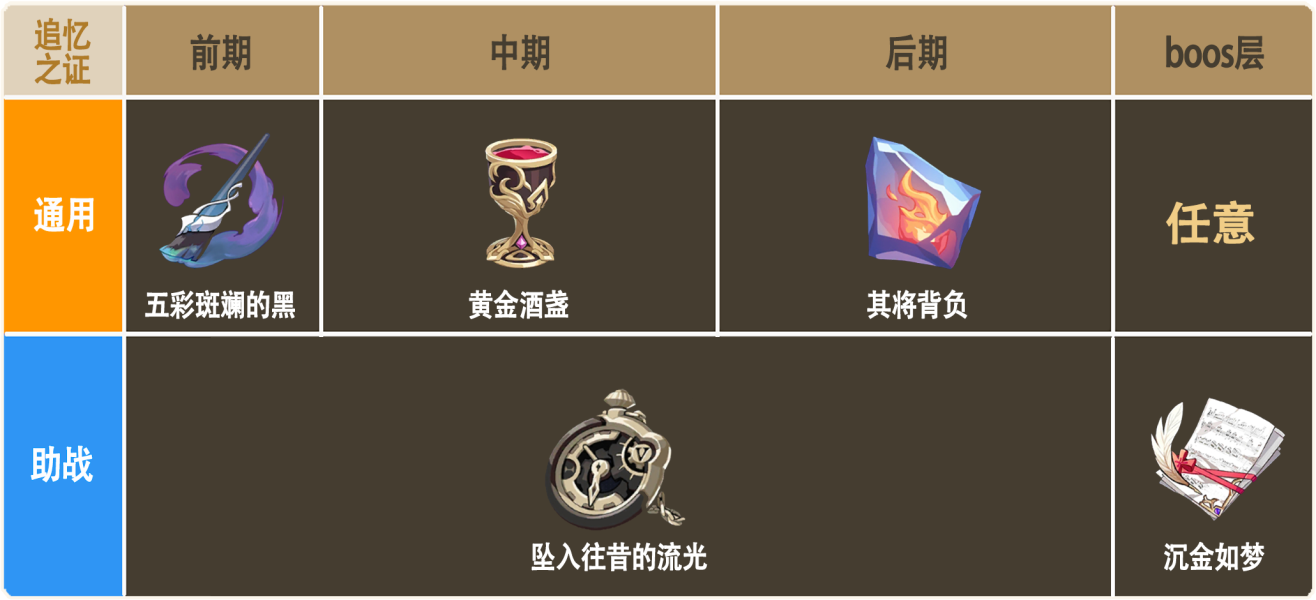 ②助战证:前面小怪层带坠入往昔的流光来提高双倍层的成功率;最后boos层可以不换,如果换的话就选沉金如梦。