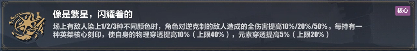 繁星一经过增强多了物理穿透后,是可以作为首选刻印的,随着后期解锁核心刻印数越多,物理穿透就越高(最高40%)。羽兔普攻流玩法可以非常频繁触发红黄染色,也可以很轻松叠满黑染色的层数,因此选这三者是最合适的。由于不考虑选繁星增幅刻印,我们可以不用选蓝染色。