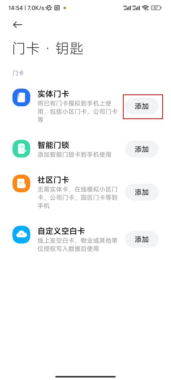 1、打开钱包app,点击门卡,再点击右下角加号,点击实体门卡后的添加。