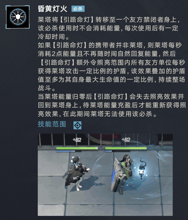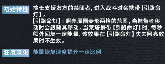 接着莱塔的特性也是挺直白的,相当于把这个【明灯】的效果重新给大家说明了一次,而回复能量的提升可以帮助莱塔加快她移动奶的cd轮转。