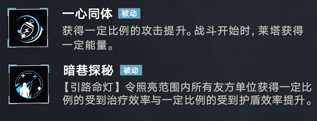然后莱塔的3/4被动技能也比较简单,3技能被动就是提升奶量,4技能被动就是进一步提升奶量和回盾量,这个护盾获取效率提升的效果应该是挺适合大盾哥的叠盾流打法的,至少可以加快叠盾流打法的效率吧......