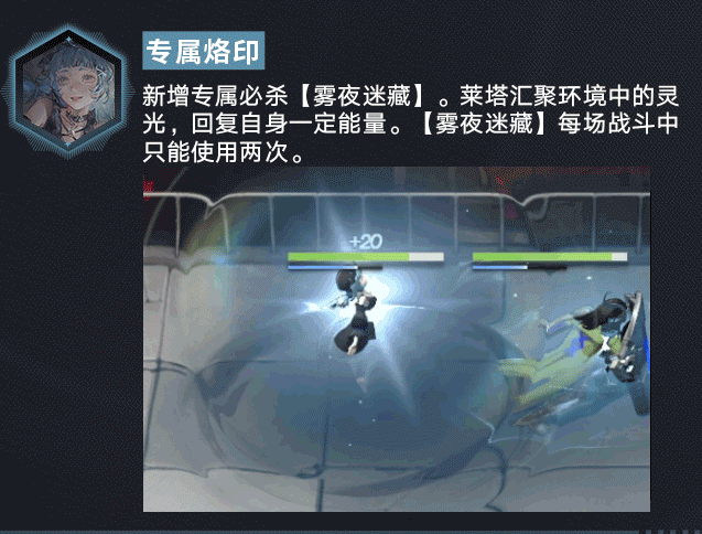 最后莱塔的专烙效果是直接回复能量,每次应该是回复基础20点能量,然后每场战斗可以用上2次,相当于进一步缩减莱塔移动奶后的cd效果,基本上也是一个必开的专烙了,因为持续奶就是莱塔最大的特点,一切能服务于持续奶的技能和效果都是值得考虑的。