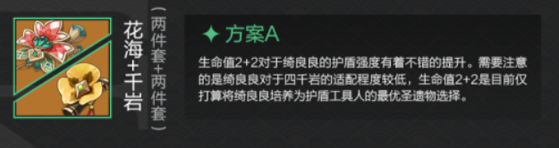 生命值2+2对于绮良良的护盾强度有不错的提升。需要注意的是绮良良对于四千岩的适配程度较低,生命值2+2是目前仅打算将绮良良培养为护盾工具人的最优圣遗物选择。