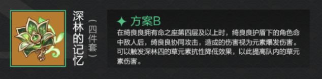 在绮良良拥有命之座第四层及以上时,绮良良护盾下的角色命中敌人后,绮良良协同攻击,造成的伤害视为元素爆发伤害。可以触发深林四的草元素抗性降低效果,以此提高队内的草元素伤害。