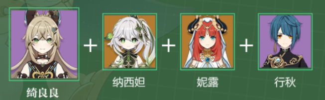 绮良良具有较高的护盾量,可以很好的保障前台站场角色不被丰穰之核的伤害波及导致血量过低。纳西妲前台站场补充草元素,队伍主要以丰穰之核的伤害为主。