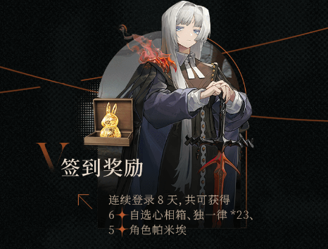 每日的登录奖励领取,玩家们每天都有精美礼品领取哦,在完成连续8天的签到任务后,可以获得自选心相箱、独一律*23和角色帕米埃。