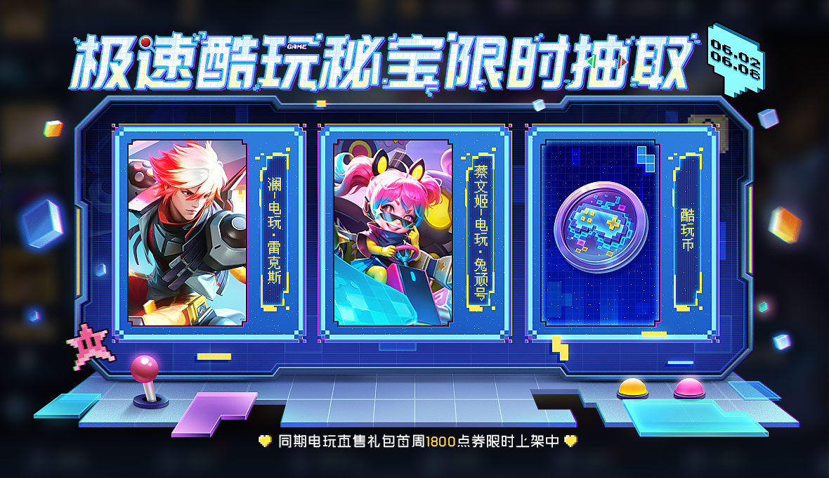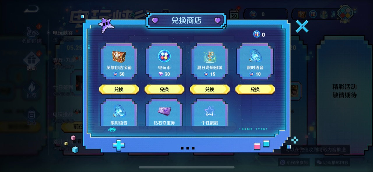 电玩峡谷活动即将上线!活动期间参与【极速酷玩-秘宝兑换中】等活动即可收集电玩币,并前往兑换商店兑换英雄自选宝箱,夏日奇旅回城,限时语音等好礼~在兑换商店使用钻石还能兑换电玩币,活动期间限兑10次哦~