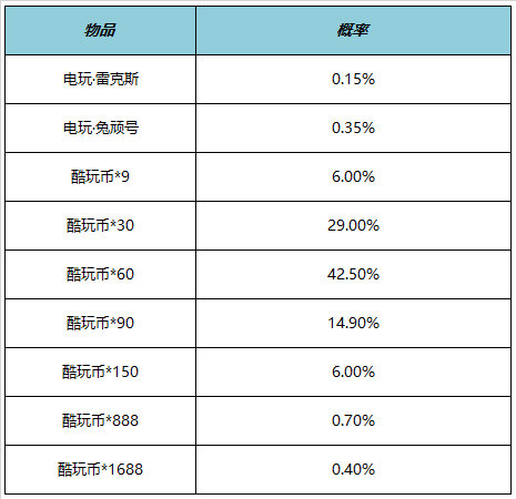 购买礼包必得酷炫机甲(1日),可额外随机获得以下之一:电玩雷克斯、电玩兔顽号、酷玩币*1688、酷玩币*888、酷玩币*150、酷玩币*90、酷玩币*60、酷玩币*30、酷玩币*9。