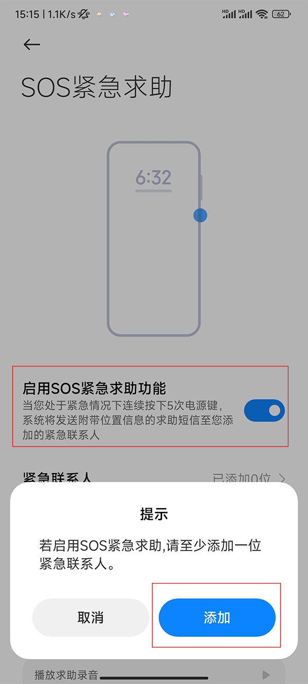 3、打开启用sos紧急求助功能的开关,点击添加。