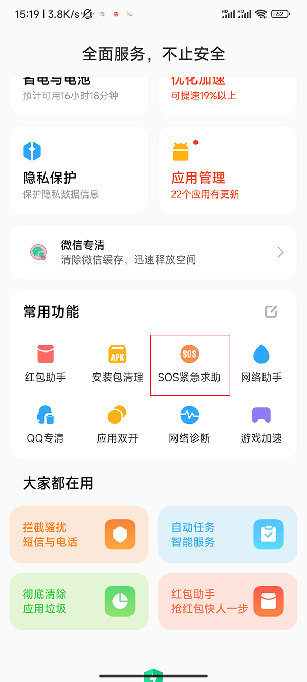1、打开手机管家app,点击sos紧急求助。