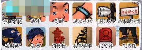 挑战巨人二八大杠答案:两条腿代驾、破洞裤、洪牛、运动手环、LED大灯、手机导航、气垫鞋、共享单车、报警器、头盔、美瞳、消防